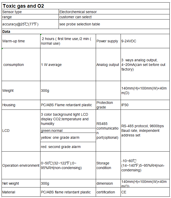 Indoor monitoring controller based on customer specific needs, it has integrated style and separated style, sensors using the world the most advanced electrochemical gas sensor,the sensor portion using a high-precision AD low temperature drift and high stability power processing circuitry to protect the instrumentation fast, accurate measurement, stable and repeatable, designed for harsh and humid environments toxic gas and oxygen measurement under. Alarming instrument has an automatic function, providing customers with on-site security.